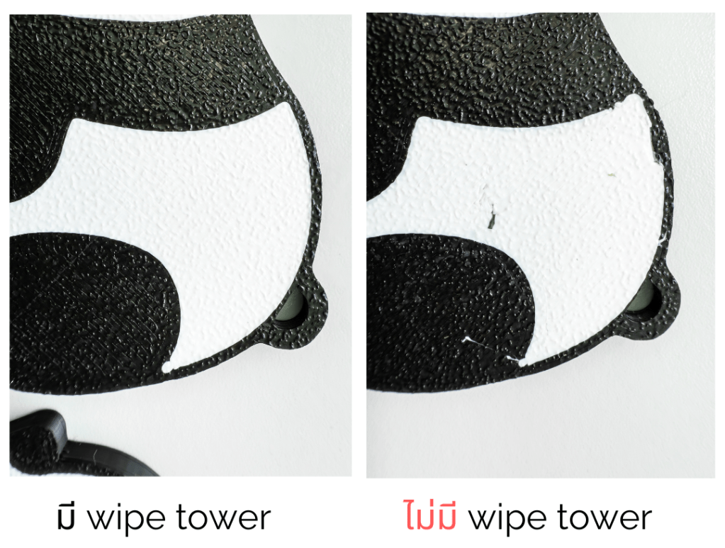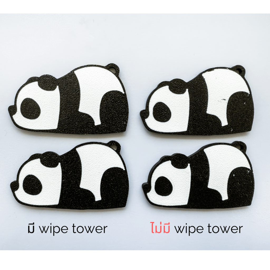 การใช้ Wipe Tower จะเป็นเพิ่มการใช้เส้นพลาสติกใน แต่ช่วยให้ผลงานดูสวยและมืออาชีพมากขึ้น